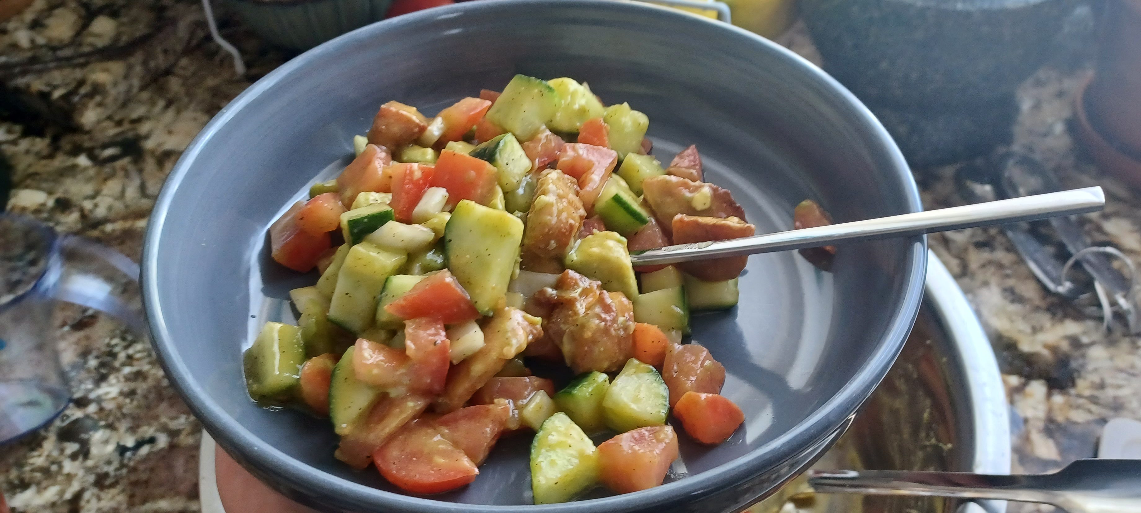 Anyway, this is a great summer salad dish, it’s refreshing, light, but can be filling thanks to the amount of veggies. I originally encountered the inspiration for this dish at a favorite local burger chain in California where it’s called the “Beach Body Salad” and includes beets (gross). My interpretation drops the beets and ups the seasoning on the chicken. I also changed the name to be less annoying. We’re all too insecure about our bodies. Whatever you got going on, somebody is into it.